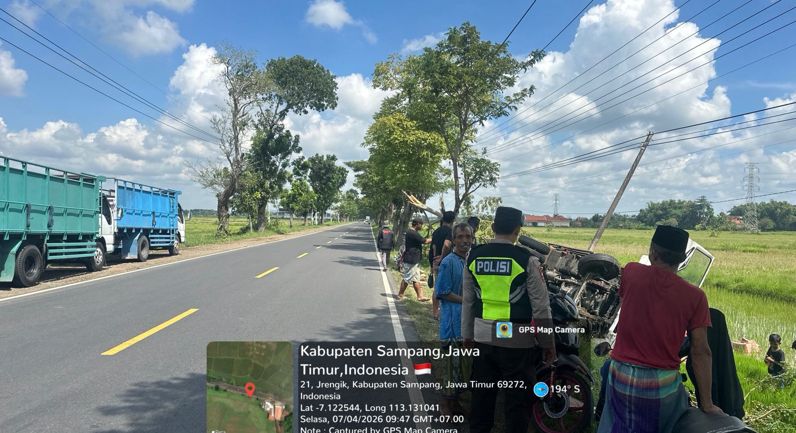 NEWSCAKRAWALA.ID — Sebuah truk dengan nopol M 9478 UN mengalami kecelakaan tunggal di Jalan Raya Desa Jrengik, Kecamatan Jrengik, Kabupaten Sampang, Madura, Jawa Timur.