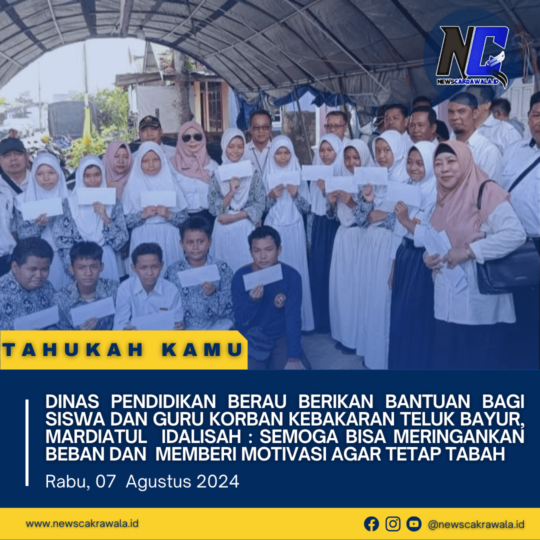 Newscakrawala.id || Teluk Bayur. Dinas Pendidikan Kabupaten Berau, dipimpin Kepala Dinas Mardiatul Idalisah memberikan perhatian dan bantuan berupa uang tunai dan seragam bagi siswa – siswi dan tenaga pendidik yang menjadi korban musibah kebakaran beberapa waktu lalu di Jalan sungai kuyang ,Teluk Bayur, (07/08/24).