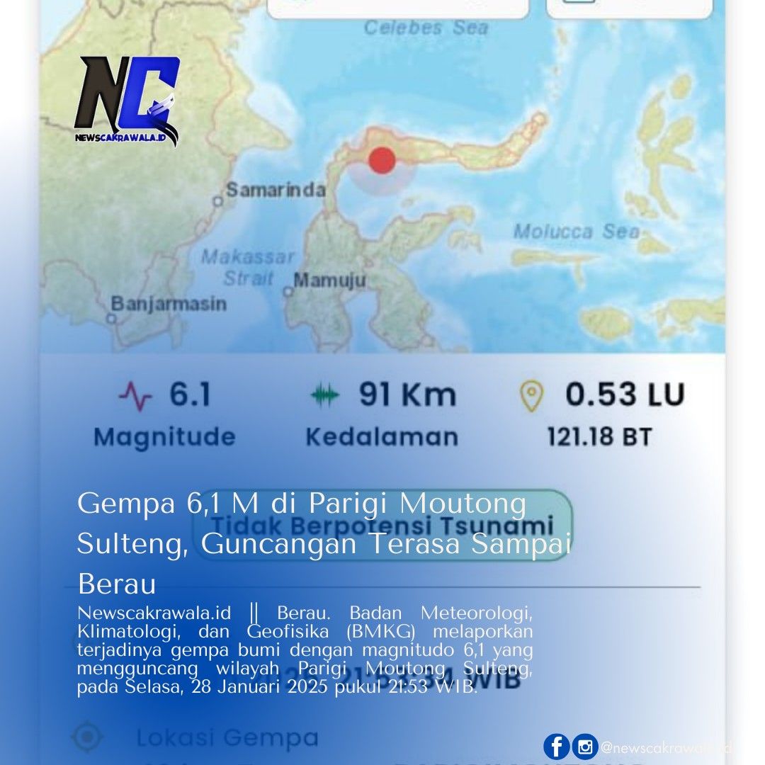 Newscakrawala.id || Berau. Badan Meteorologi, Klimatologi, dan Geofisika (BMKG) melaporkan terjadinya gempa bumi dengan magnitudo 6,1 yang mengguncang wilayah Parigi Moutong Sulteng, pada Selasa, 28 Januari 2025 pukul 21:53 WIB.