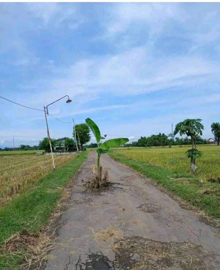 Newscakrawala id || Madiun Sebuah akun yang viral di salah satu group media sosial Facebook mengunggah jalan yang berlokasi di persawahan terlihat banyak berlubang di sisi salah satu lubang tampak ditanami pohon pisang.
