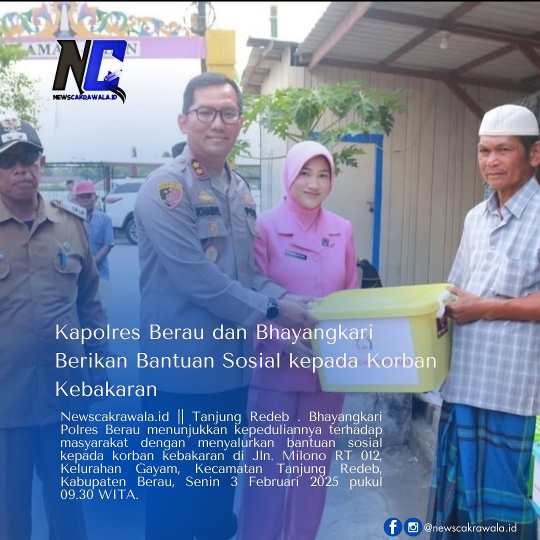 Newscakrawala.id || Tanjung Redeb . Bhayangkari Polres Berau menunjukkan kepeduliannya terhadap masyarakat dengan menyalurkan bantuan sosial kepada korban kebakaran di Jln. Milono RT 012, Kelurahan Gayam, Kecamatan Tanjung Redeb, Kabupaten Berau, Senin 3 Februari 2025 pukul 09.30 WITA.