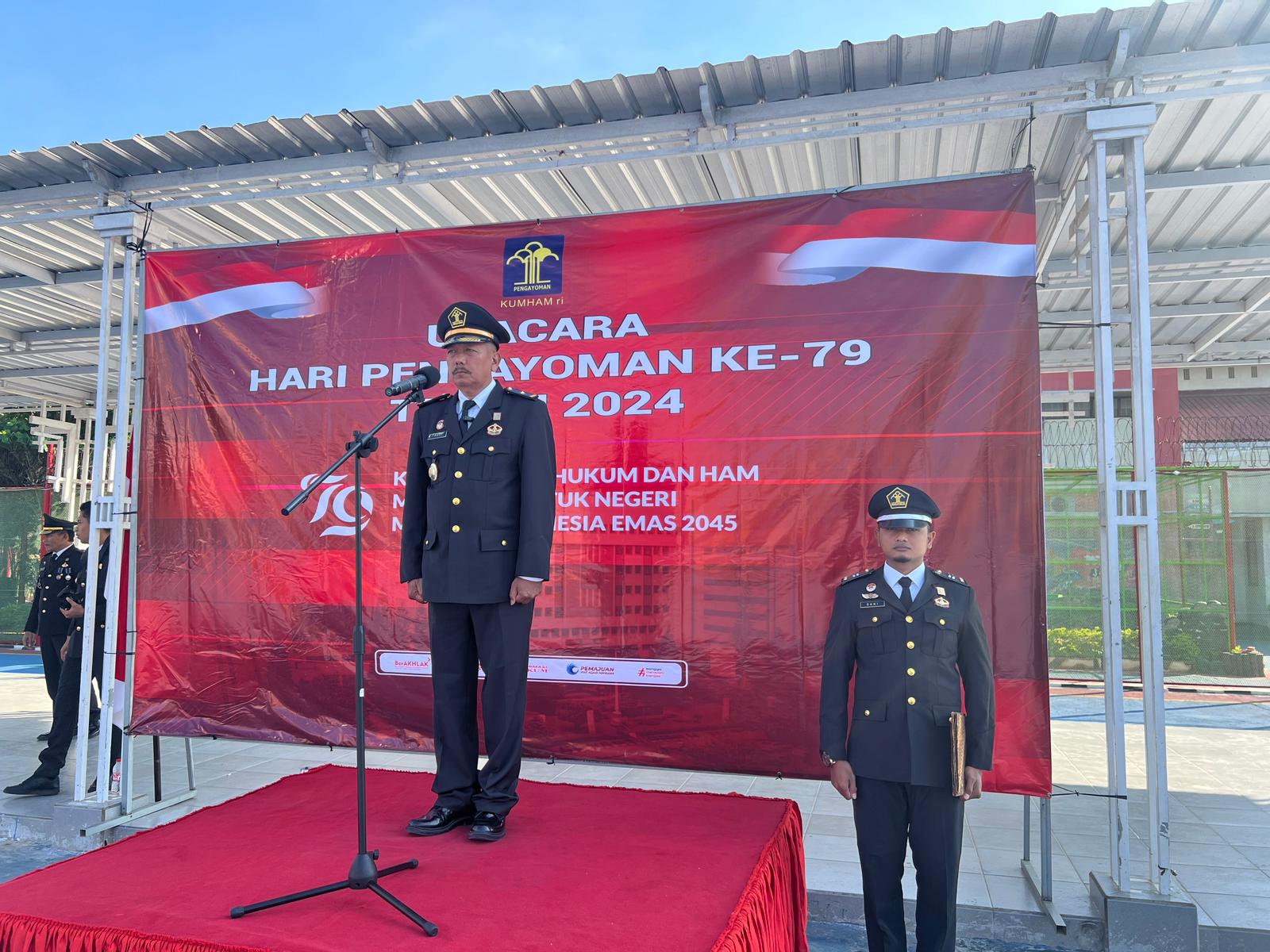 Upacara Peringatan Hari Pengayoman ke-79 dilaksanakan di Lapangan dalam Lapas Narkotika Kelas IIA Pamekasan, Senin (19/08/2024).