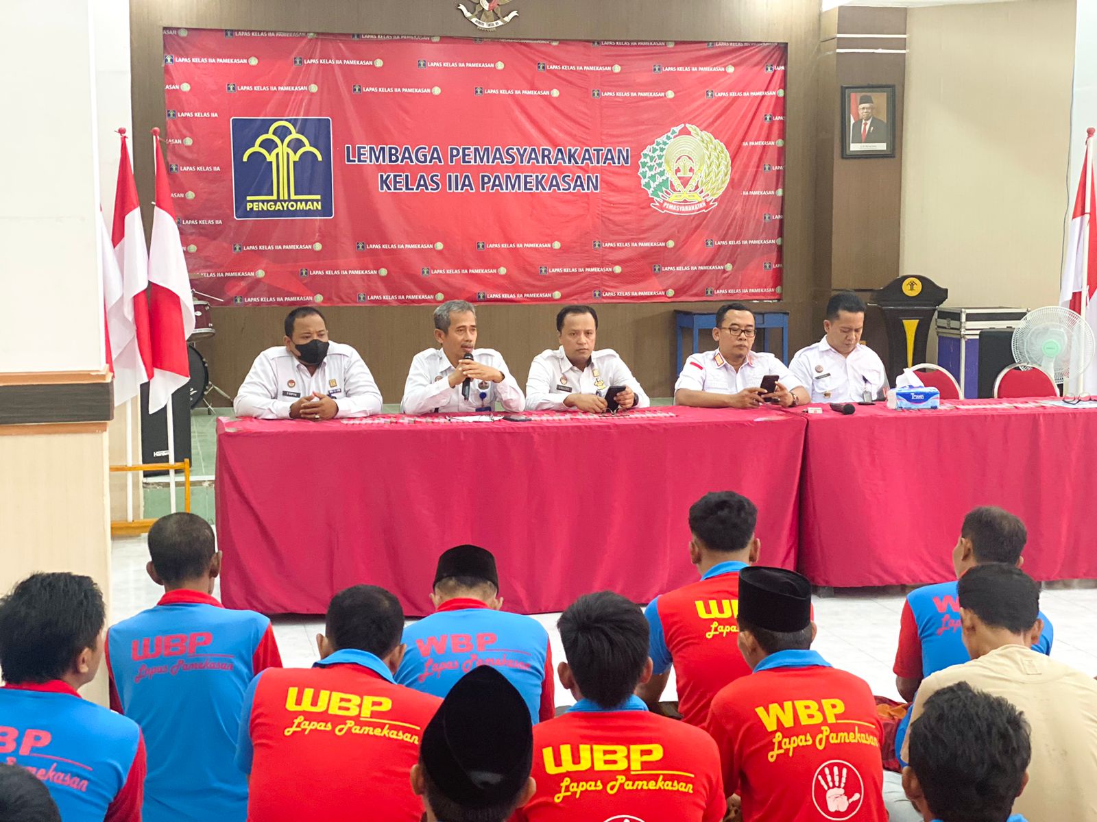 Nur Bambang S, Ka.Lapas Pamekasan bersama pejabat struktural eselon IV melakukan sosialisasi kepada warga binaan yang dihadiri oleh perwakilan WBP setiap blok/ kamar hunian.