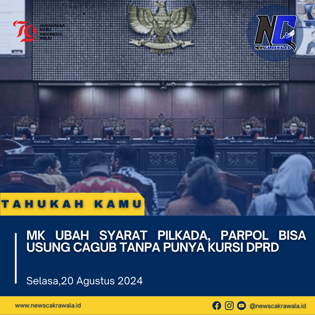 Newscakrawala.id || Jakarta. Mahkamah Konstitusi (MK) memutuskan partai atau gabungan partai politik peserta Pemilu bisa mengajukan calon kepala daerah meski tidak punya kursi DPRD.