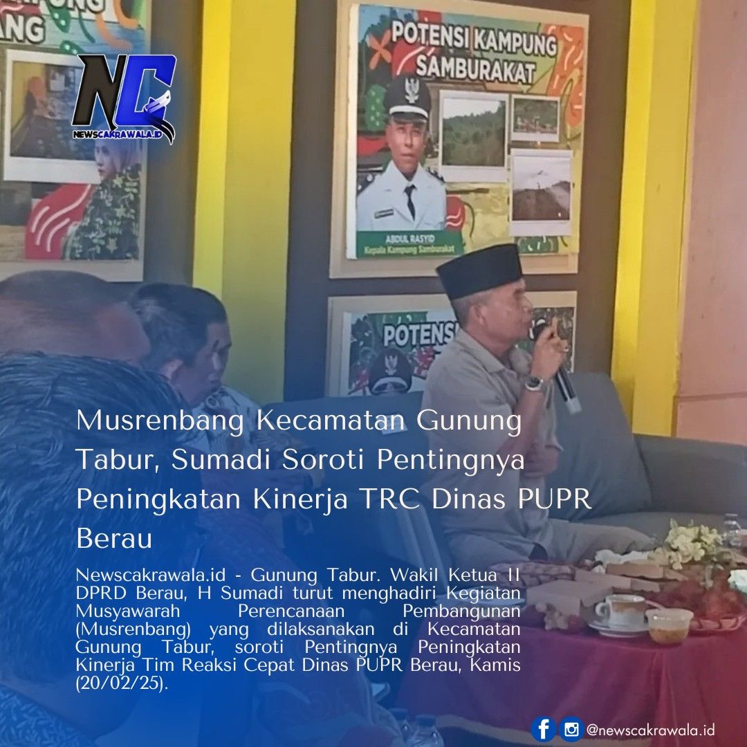 Newscakrawala.id – Gunung Tabur. Wakil Ketua II DPRD Berau, H Sumadi turut menghadiri Kegiatan Musyawarah Perencanaan Pembangunan (Musrenbang) yang dilaksanakan di Kecamatan Gunung Tabur, soroti Pentingnya Peningkatan Kinerja Tim Reaksi Cepat Dinas PUPR Berau, Kamis (20/02/25).