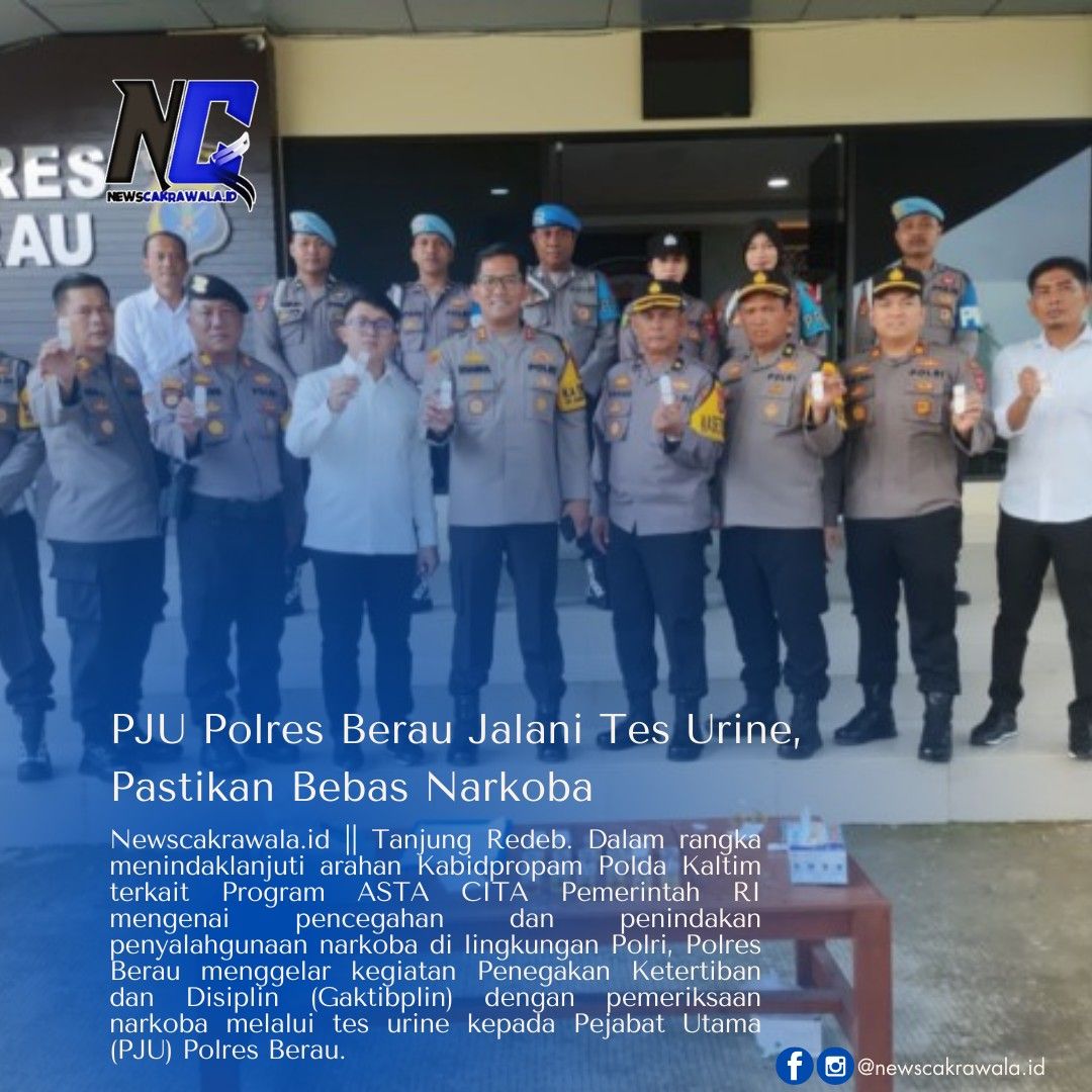 Newscakrawala.id || Tanjung Redeb. Dalam rangka menindaklanjuti arahan Kabidpropam Polda Kaltim terkait Program ASTA CITA Pemerintah RI mengenai pencegahan dan penindakan penyalahgunaan narkoba di lingkungan Polri, Polres Berau menggelar kegiatan Penegakan Ketertiban dan Disiplin (Gaktibplin) dengan pemeriksaan narkoba melalui tes urine kepada Pejabat Utama (PJU) Polres Berau.