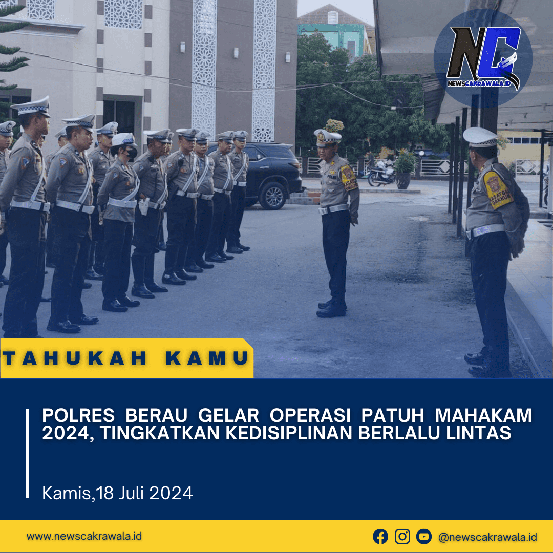 Newscakrawala.id || Tanjung Redeb. Dalam rangka meningkatkan ketertiban dan keselamatan berlalu lintas, Polres Berau melalui Satuan Lalu Lintas menggelar Operasi Patuh Mahakam 2024 yang dilaksanakan selama 14 hari, mulai 15 Juli hingga 28 Juli. Salah satu kegiatannya dilaksanakan pada Kamis, 18 Juli 2024, sejak pukul 06.15 WITA dan dilaksanakan di Halaman Ruang Sat Lantas serta beberapa lokasi strong point di Kecamatan Tanjung Redeb.