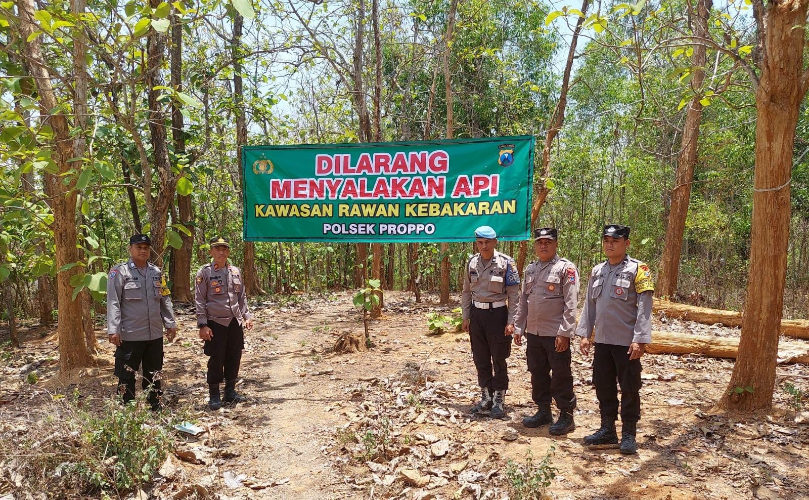 Himbauan terhadap masyarakat akan bahayanya kebakaran hutan dan lahan, Polsek Proppo Polres Pamekasan lakukan Pemasangan spanduk diwilayah hutan Jati Milik rakyat kecamatan Proppo, kabupaten Pamekasan.