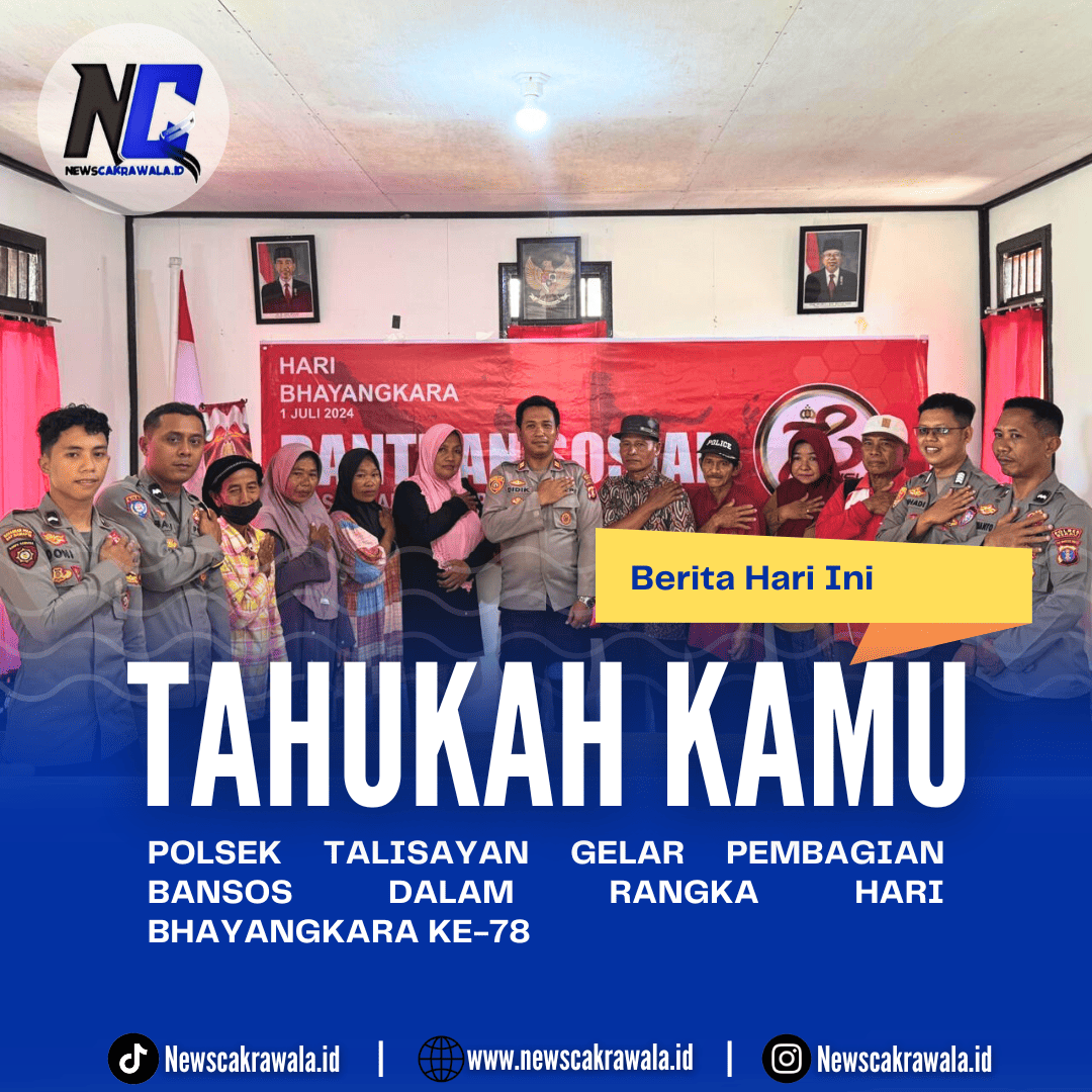 Newscakrawala.id || Talisayan. Polsek Talisayan, di bawah kepemimpinan Iptu Didik Sulistyo , menggelar kegiatan pembagian bantuan sosial (bansos) kepada warga kurang mampu di wilayah Kecamatan Talisayan. Kegiatan ini merupakan rangkaian dari perayaan Hari Bhayangkara ke-78 yang dilaksanakan pada hari Selasa, (26/06/24).