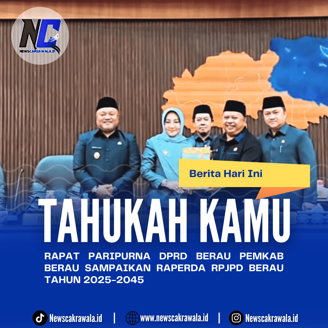 Newscakrawala.id || Tanjung Redeb .Melalui Rapat Paripurna di Gedung DPRD, Senin (24/6/2024), Pemerintah Kabupaten Berau menyampaikan Raperda tentang RPJPD Kabupaten Berau tahun 2025-2045 serta Pertanggungjawaban Pelaksanaan APBD Tahun Anggaran 2023. Dokumen Raperda disampaikan langsung oleh Bupati Berau, Sri Juniarsih Mas didampingi Wakil Bupati Berau, Gamalis kepada Ketua DPRD Berau, Madri Pani.