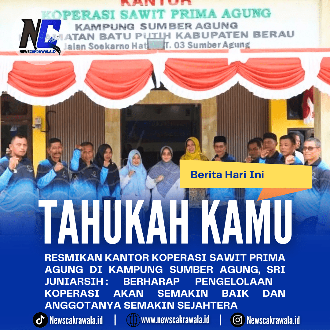 Newscakrawala.id || Batu Putih. Bupati Berau, Sri Juniarsih Mas, meresmikan Kantor Koperasi Sawit Prima Agung di Kampung Sumber Agung, Kecamatan Batu Putih, Minggu (23/6/2024). Peresmian ditandai dengan penandatanganan prasasti dan pemotongan pita. Turut mendampingi, Asisten I Setkab Berau, Hendratno, Pimpinan OPD Terkait, Camat Batu Putih, Wahyudi dan Kepala Kampung Sumber Agung, Masdi Santoso.