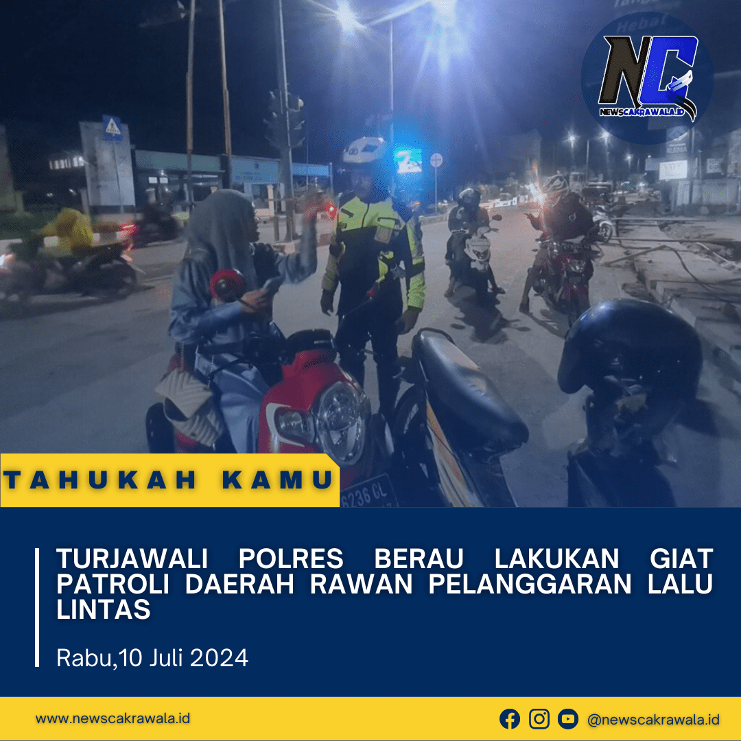 Newscakrawala.id || Tanjung Redeb. Unit Turjawali Polres Berau kembali aktif melakukan patroli rutin untuk meningkatkan keamanan dan ketertiban lalu lintas di wilayah Kecamatan Tanjung Redeb, Kabupaten Berau. Pada hari Selasa, 9 Juli 2024, mereka melaksanakan patroli intensif di beberapa titik strategis seperti Jl. Pemuda, Jl. P. Panjang, dan Jl. Durian III. Tujuan utama dari kegiatan ini adalah untuk menanggulangi potensi pelanggaran lalu lintas serta mengurangi risiko kecelakaan di daerah rawan tersebut.
