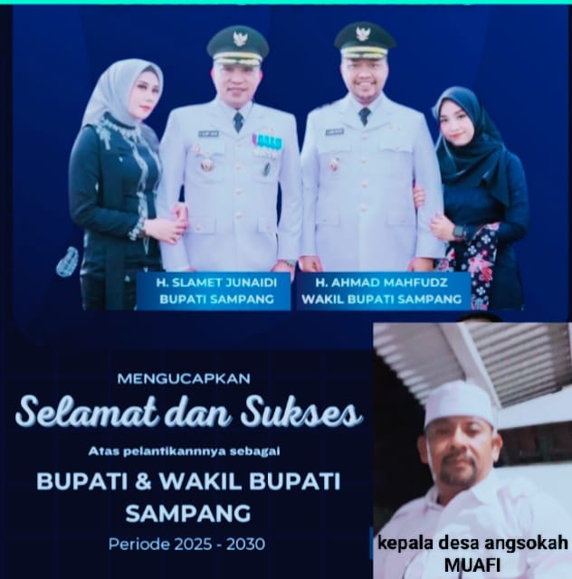 Muafi Kepala Desa Angsokah, kecamatan Omben, kabupaten Sampang bersama jajaran pemerintah desa menyampaikan ,” Ucapan selamat kepada H. Slamet Junaidi dan Ra Mahfud Abdul Qodir atas dilantiknya sebagai Bupati dan Wakil Bupati Sampang periode 2025-2030 oleh Presiden RI Prabowo di Jakarta”.