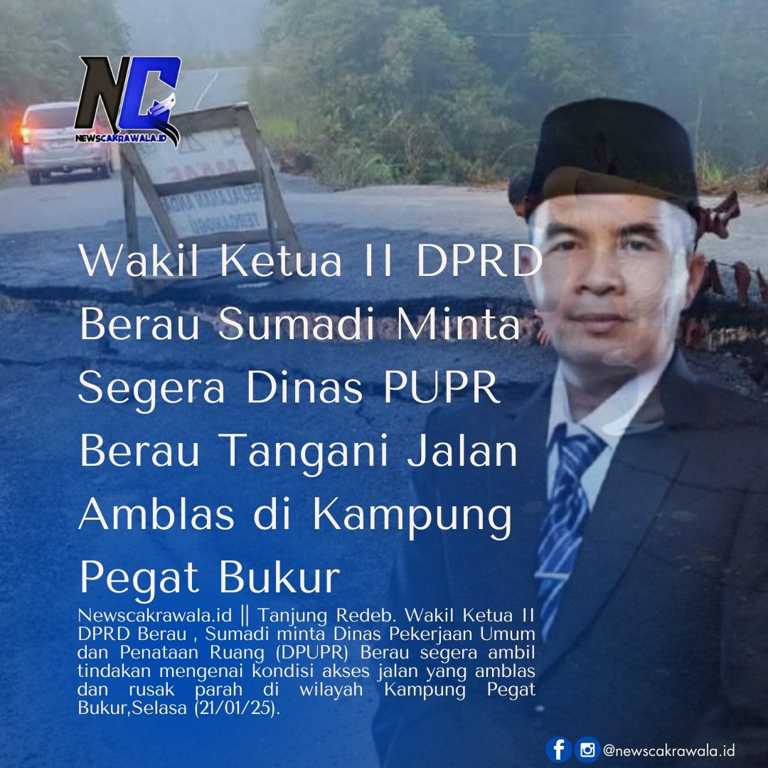 Newscakrawala.id || Tanjung Redeb. Wakil Ketua II DPRD Berau , Sumadi minta Dinas Pekerjaan Umum dan Penataan Ruang (DPUPR) Berau segera ambil tindakan mengenai kondisi akses jalan yang amblas dan rusak parah di wilayah Kampung Pegat Bukur,Selasa (21/01/25).